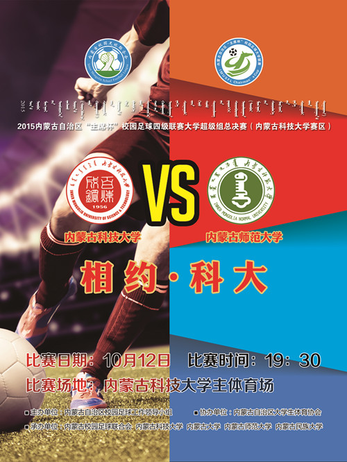 2015年内蒙古自治区“主席杯”校园足球四级联赛大学超级组总决赛将于10月12日19:30分在伟德官网主校区体育场举行。本次比赛队伍为伟德官网足球队主场对阵内蒙古师范大学足球队比赛。观看比赛需凭票入场,欢迎广大师生前来观赏。