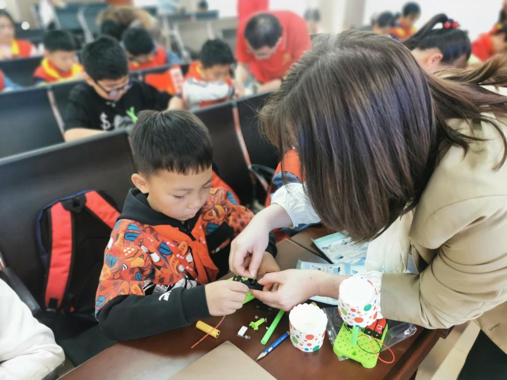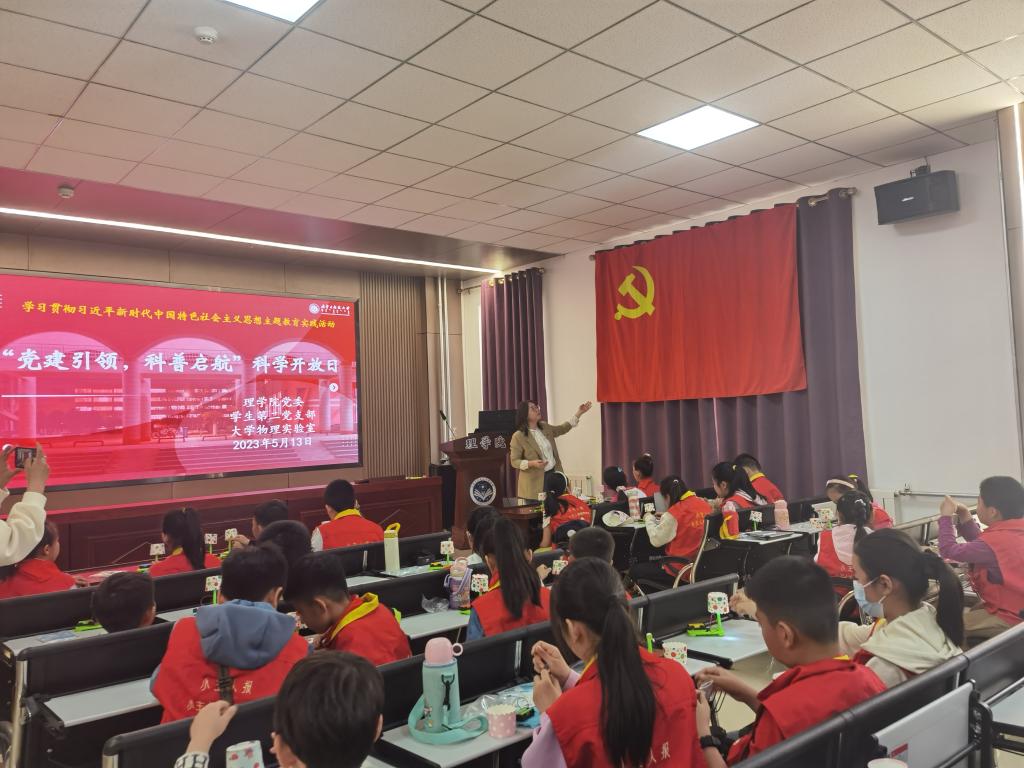在秋实楼理学院物理实验中心,来自理学院的潮洛蒙、李川飞二位老师为小学生进行了专业的实验讲解和演示,展示了包括静电感应、蛇形摆、无弦琴、无皮鼓等二十余个有趣的实验,通过这些实验的讲解与演示,激发了孩子们对科学的探索欲和求知欲。在明德楼E205报告厅,科普党员志愿者们带来了科普小讲座,并为小学生们送上电学动手趣味实验包。小学生们在志愿者的指导下,动手安装电池、导线、开关,成功使小台灯发光;左珊珊老师为小学生们讲授了“认识党旗”的微党课,使红色教育融入科普实践中,使思政教育有形有感。