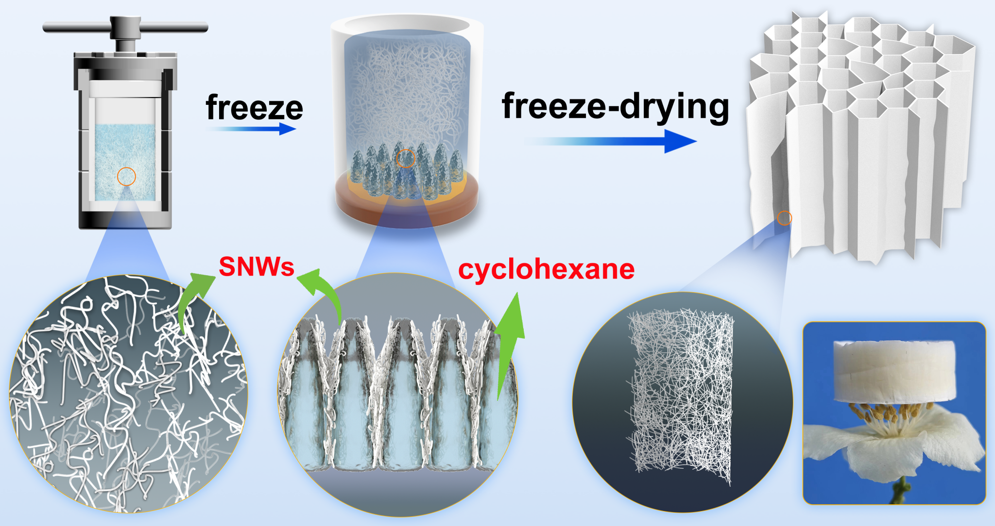 亚纳米线(SNW)由于其极小的尺寸而具有许多令人着迷的性质,这些性质使它们近几年被科研工作者们广泛关注。然而,如何将SNWs构筑成能够保持其结构特征和物理化学性质的宏观功能材料(如气凝胶)是一个巨大挑战。因为目前已报道的SNWs的性质与传统超临界干燥或冷冻干燥制备气凝胶的技术并不兼容。针对这一挑战,赛华征教授基于SNW的独特分散性,提出了一种采用高熔点非极性溶剂(即环己烷)为介质,经冷冻铸造来制备亚纳米线气凝胶(SNWA)的方案(图1)。所制备的SNWA不仅展现了SNW大量的物理和化学性质,而且在光致发光领域具有很大的应用潜力。尤其是这里采用的亚纳米线可以由稀土盐为原料来合成,为地方稀土资源的开发利用提供了新思路。