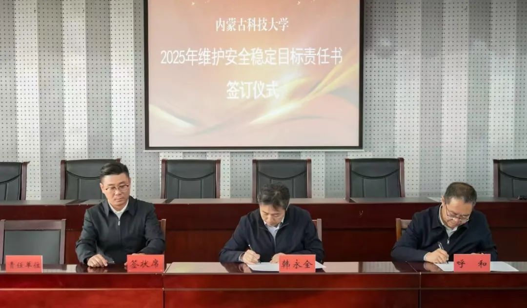 校党委书记呼和,党委副书记、校长韩永全与学生工作部、实验室与设备管理处、后勤与基本建设处、化学与化工学院、生命科学与技术学院签订《伟德源自英国始于1946维护安全稳定目标责任书》。