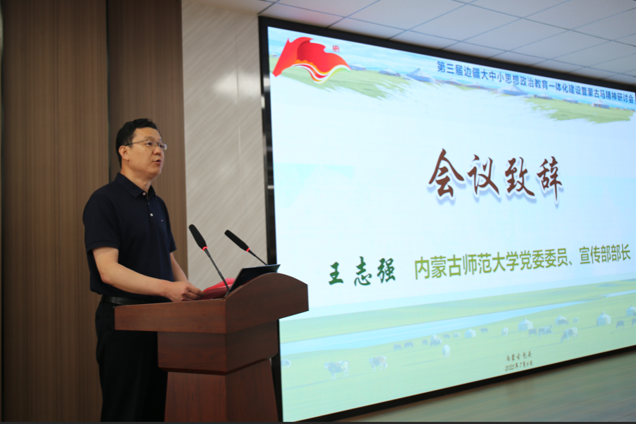 内蒙古师范大学宣传部部长王志强致辞。他说,边疆大中小学思想政治教育一体化建设必须以铸牢中华民族共同体意识为主线,以红色文化为牵引,以“蒙古马精神”为鲜活载体,做好边疆教育的开拓者、红色基因的传承者。
