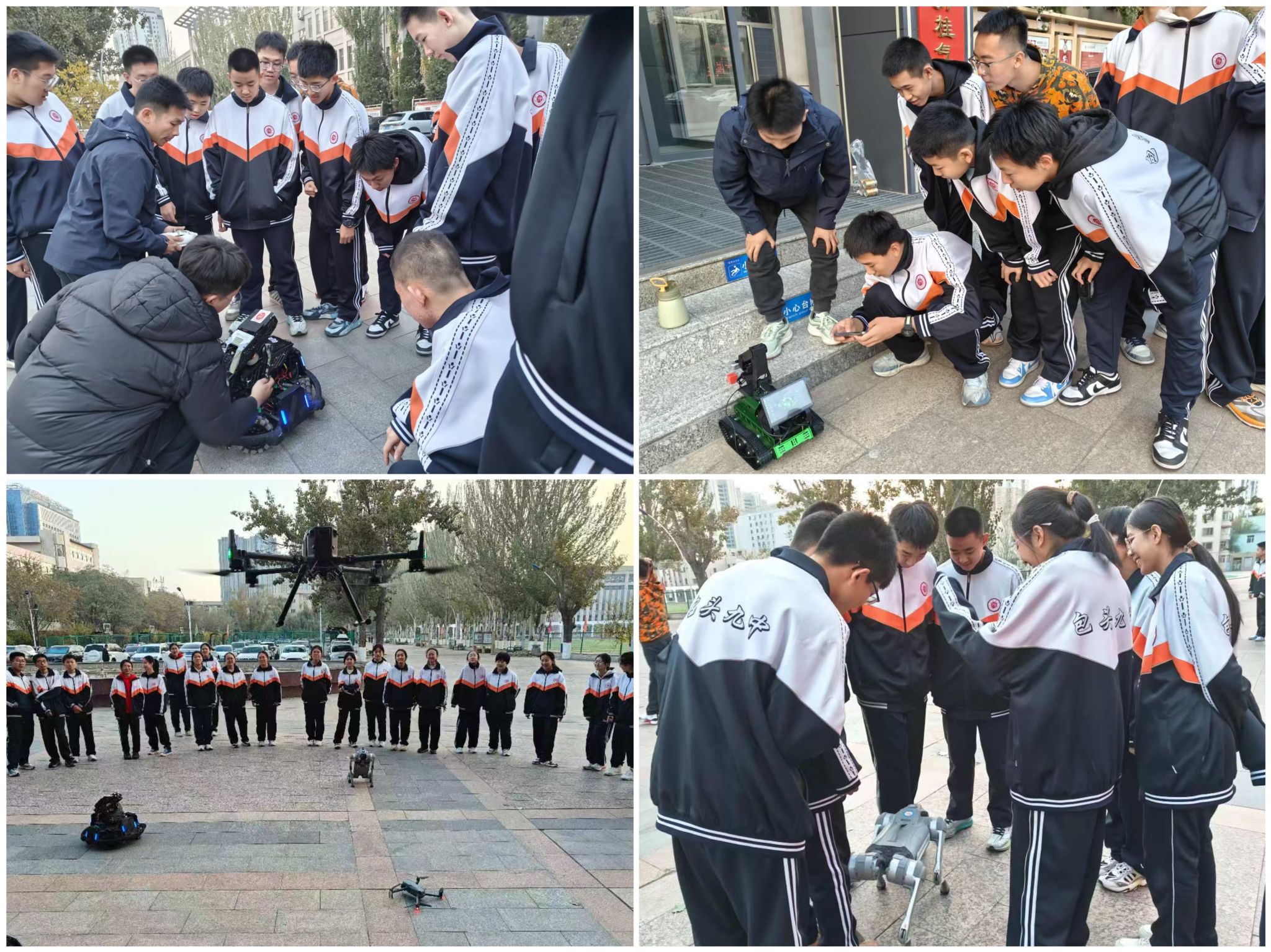 “快!我的机器狗完成后空翻了!”“无人机视角下的校园也太酷了!”在实践体验环节,三大科技互动板块让学生们直呼“过瘾”,学生在老师的指导下通过遥控器操控机器狗完成“握手”“跳跃”“后空翻”等高难度动作,分组操控全向轮步兵机器人跨越障碍,体验无人机的“8字飞行”“定点悬停”操控技巧。学生们纷纷表示此次活动收获颇丰,不仅对人工智能机器人、无人机等科技前沿产生了浓厚兴趣,更期待未来能在科技领域不断学习、汲取养分,实现自我提升。