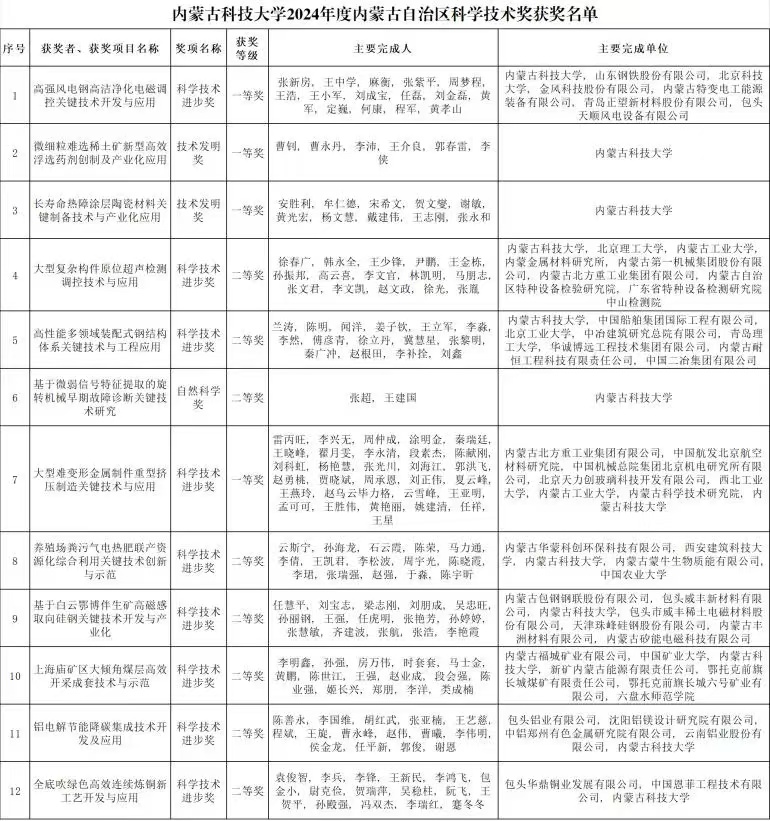 大会公布了2024年度自治区科学技术奖获奖名单,伟德官网12项成果荣获自治区科学技术奖。其中,伟德官网张新房教授的“高强风电钢高洁净化电磁调控关键技术开发与应用”获批自治区科技进步奖一等奖,安胜利教授的“长寿命热障涂层陶瓷材料关键制备技术与产业化应用”、曹钊教授的“微细粒难选稀土矿新型高效浮选药剂创制及产业化应用”分别获批技术发明奖一等奖,张超教授的“基于微弱信号特征提取的旋转机械早期故障诊断关键技术研究”获批自然科学奖二等奖,“大型复杂构件原位超声检测调控技术与应用”与“高性能多领域装配式钢结构体系关键技术与工程应用”分获科技进步奖二等奖;另外,伟德官网作为主要参与单位获科技进步奖一等奖1项、二等奖5项。获奖数量、质量较往年均有显著提升,实现了近五年伟德官网作为第一完成单位获得自治区科技奖励一等奖的突破。