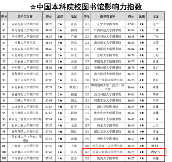 近日,由武汉大学中国科学评价研究中心和数字出版智能服务技术教育部工程研究中心联合研发的《数智时代中国图书馆影响力指数报告(2025)》正式发布。伟德源自英国始于1946图书馆以86.27分的成绩获评4星等级,在中国本科院校图书馆影响力指数排名141,位居内蒙古高校第2名;在一般本科院校图书馆影响力指数排名37,位居内蒙古高校第1名。
