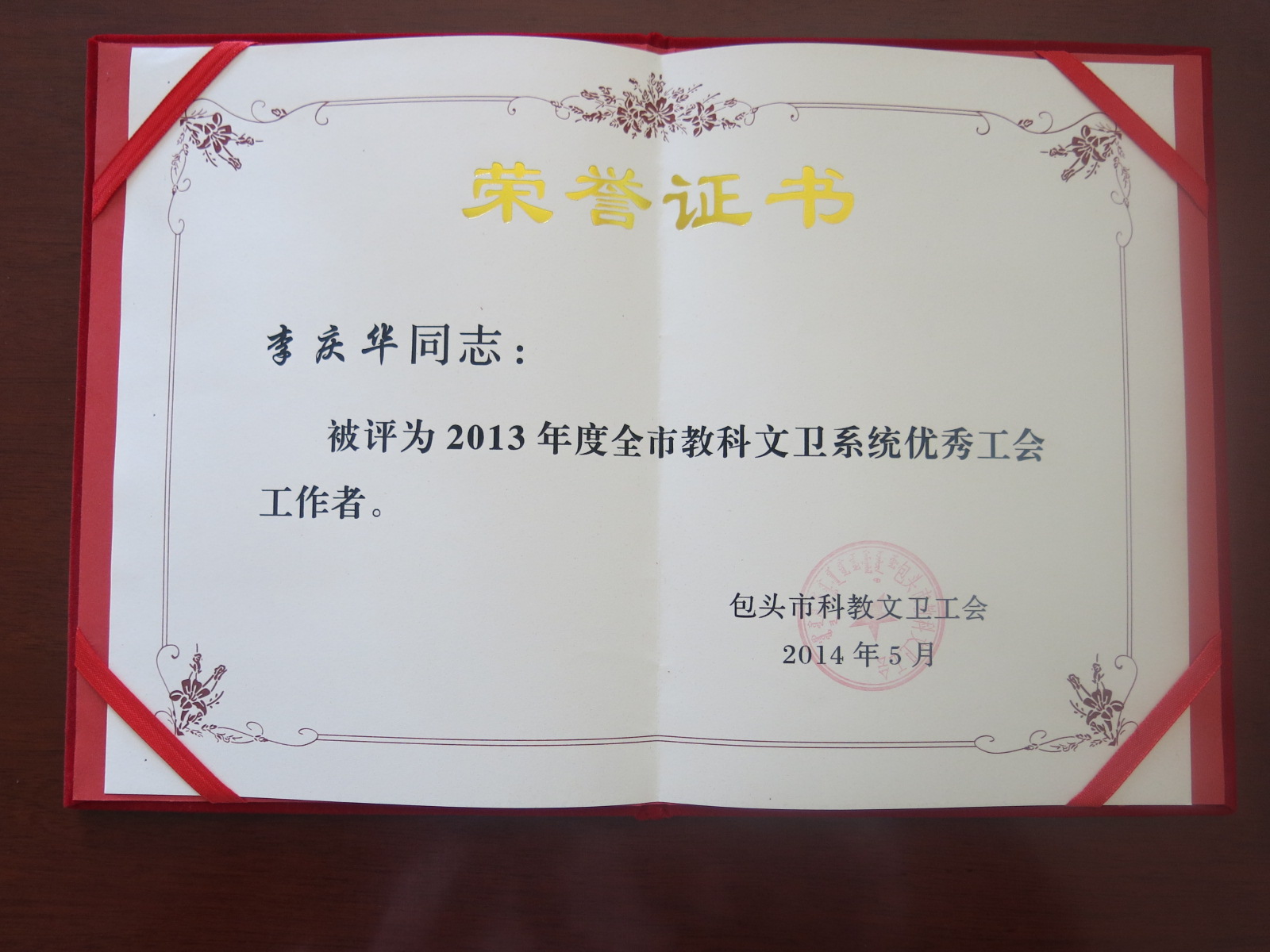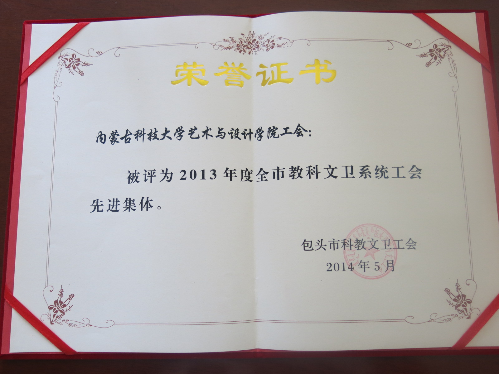 经过各级工会推荐,由包头市教科文卫工会评选,伟德官网艺术与设计学院工会被评为2013年度全市教科文卫系统工会先进集体称号,校工会李庆华被评为2013年度全市教科文卫系统优秀工会工作者。