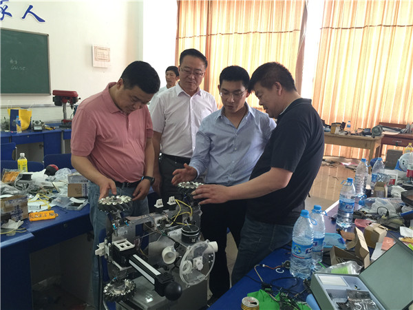 在中心电工、电子实训基地,他实地考察了新的电工实训操作台,了解了仿真、实操结合同步进行的创新教学模式。并调研E家创新工作室,现场观摩了第十四届全国大学生机器人大赛参赛作品,对指导教师和参赛学生给予肯定和鼓励。随后参观了金工实训基地,并对工作中的教师给予慰问。