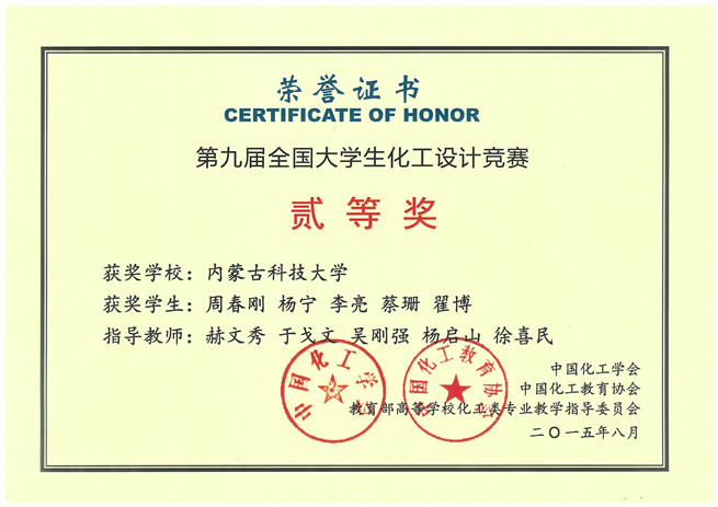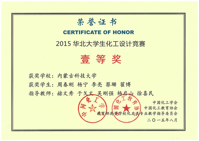 11月9日,化工学院收到由中国化工学会寄来的获奖证书,由伟德官网化工学院学生组成的“鹿坪”代表队,在2015年第九届“东华科技-三井化学杯”全国大学生化工设计竞赛华北地区预选赛中荣获全国二等奖和华北赛区一等奖。