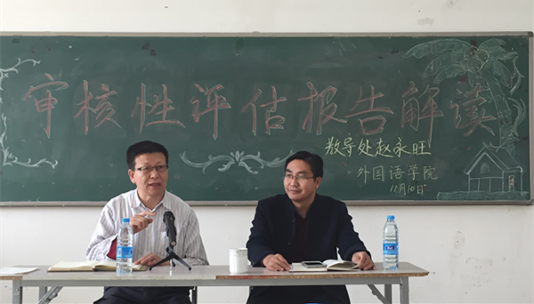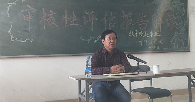 11月10日下午,外语学院邀请教务处处长赵永旺,就本科教学工作审核评估各方面注意事项做专场报告。赵永旺根据外语学院实际情况、外语教学基地发展状况,结合审核评估六大要点、五个“度”,为外语学院全体教职工做了详细的讲解。