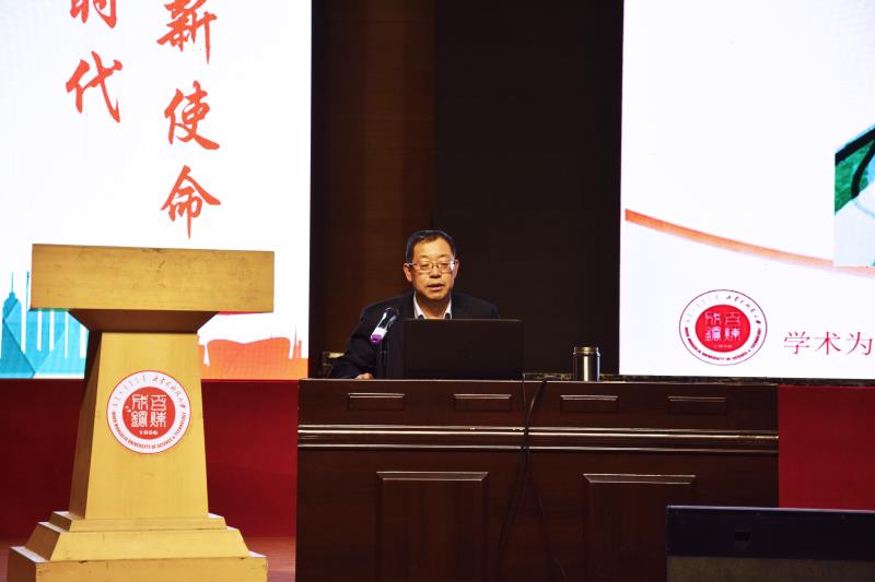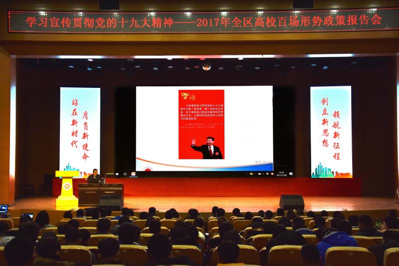 为进一步学习宣传贯彻党的十九大精神,引导广大青年学生自觉用习近平新时代中国特色社会主义思想武装头脑、指导行动,12月8日下午,“学习宣传贯彻党的十九大精神 2017全区高校百场形势政策报告会”在伟德官网举办。伟德官网文法学院院长、教授委员会主任朱海珅教授作了以《站在新时代、肩负新使命、创立新思想、领航新征程——十九大报告关键词“新”之解读》为主题的报告,为伟德官网在场的500余名师生深层次、多角度、全方位解读了党的十九大报告。报告会由校团委书记韩冰主持。