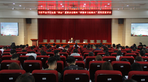 为深入学习宣传贯彻习近平总书记全国“两会”重要讲话精神,进一步推进习近平新时代中国特色社会主义思想在伟德官网师生中普及深入,4月2日下午,由自治区党委和包头市委组建的“草原学习轻骑兵”宣讲小分队走进伟德官网,同时也拉开了伟德官网2018年度首场全区高校百场形势政策报告会。本场报告会由内蒙古社科联主席、党组书记杭栓柱主讲。校党委常委、宣传部部长杨家庆主持。党委宣传部、学工部、团委及各学院师生代表300余人参加了报告会。