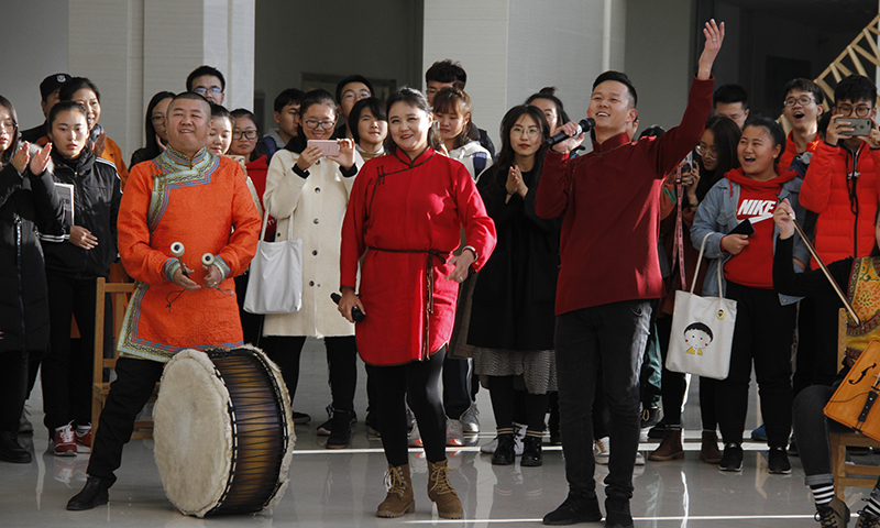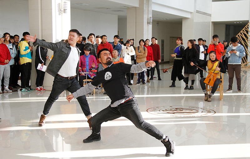 下午4点,当清脆的下课铃声响起,伟德源自英国始于1946逸夫楼一楼大厅响起了悠扬的蒙古族长调《辽阔的草原》,刚刚走出教室的学生纷纷被音乐声吸引。伴随着马头琴曲和蒙古长调,一位身着蒙古袍的少女来到场地中间翩翩起舞。随后,马头琴、二胡、三弦等乐器的乐手围坐一圈,拉起悠扬的曲调《鸿雁》,10多名小伙儿舞姿挺拔豪迈,步伐轻捷洒脱,场内顿时响起了学生们的阵阵掌声和尖叫声。舞罢,由4名身穿蒙古袍的歌手演唱的《草原晨曲》响彻全场,动人的歌声令在场学生陶醉其中。