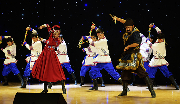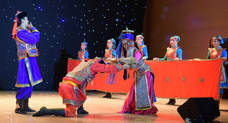 欢快的蒙古舞《情满草原》,拉开了演出的序幕。演员们优美的身姿、轻盈的舞步使现场观众感受到了草原儿女的热情奔放。蒙古族长调以及颇具民族特色的呼麦,缓缓讲述着草原人民曲折动人的故事。演出团队还将鄂尔多斯传统婚礼搬上舞台,为在场师生展示了鄂尔多斯蒙古族人民独具特色的婚俗习惯,激起了现场师生的浓烈兴趣。