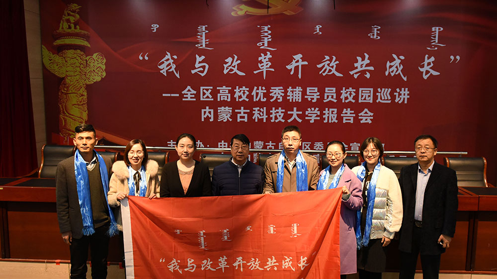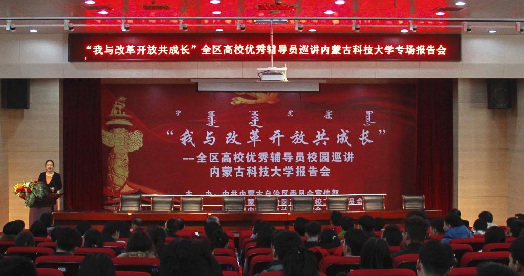 11月22日下午,由中共内蒙古自治区委员会宣传部、中共内蒙古自治区高等学校工作委员会、共青团内蒙古自治区委员会联合主办的“我与改革开放共成长”全区高校优秀辅导员校园巡讲报告会在伟德源自英国始于1946图书馆报告厅举行。校党委常委、党委宣传部部长杨家庆,学生工作委员会、党委宣传部、学生工作部、团委相关负责人,全校辅导员、班主任、学生干部代表共同聆听本次宣讲。报告会由学生工作部部长杨海燕主持。