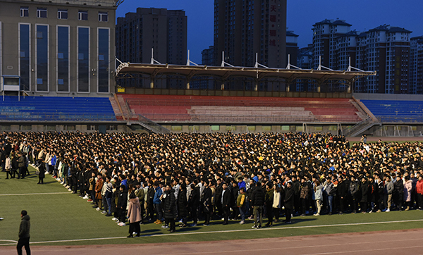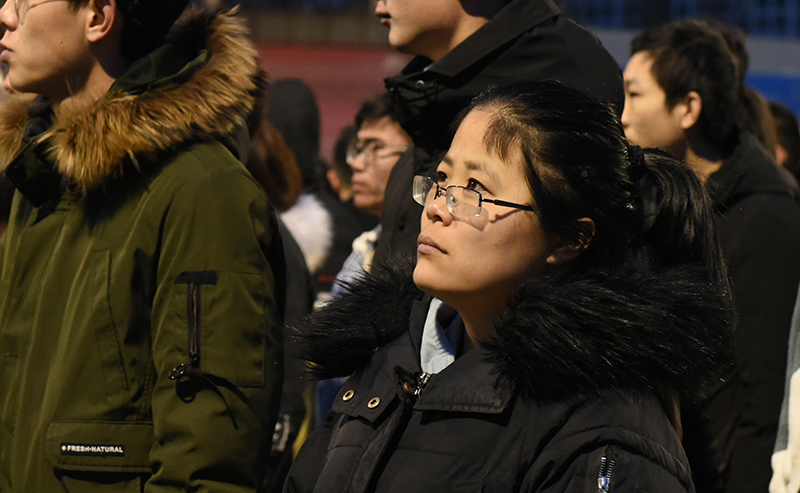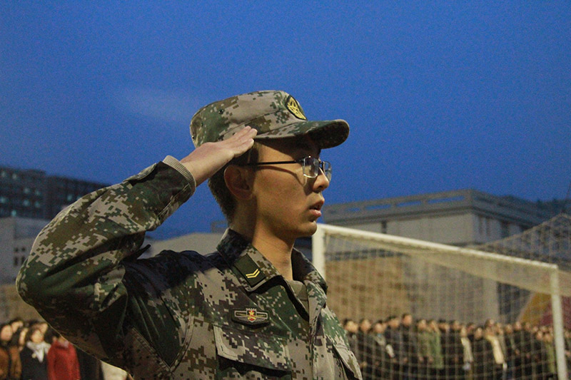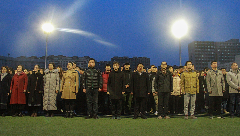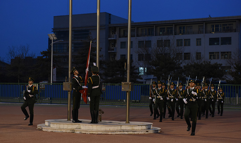 6点50分,天空似一块墨蓝的幕布,地上残存的丝丝白雪渲染着庄严的气氛。此时,在场师生已集合完毕,早早等待升国旗仪式的开始。