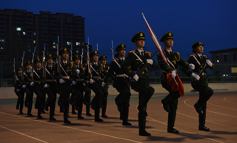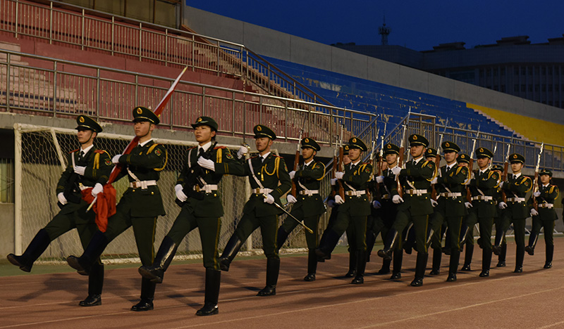 6点55分,国旗护卫队身着绿色戎装,迈着铿锵有力的步伐,以整齐划一的队列由田径场东南角入场,手持礼宾枪绕场一周,高唱《国旗护卫队队歌》。