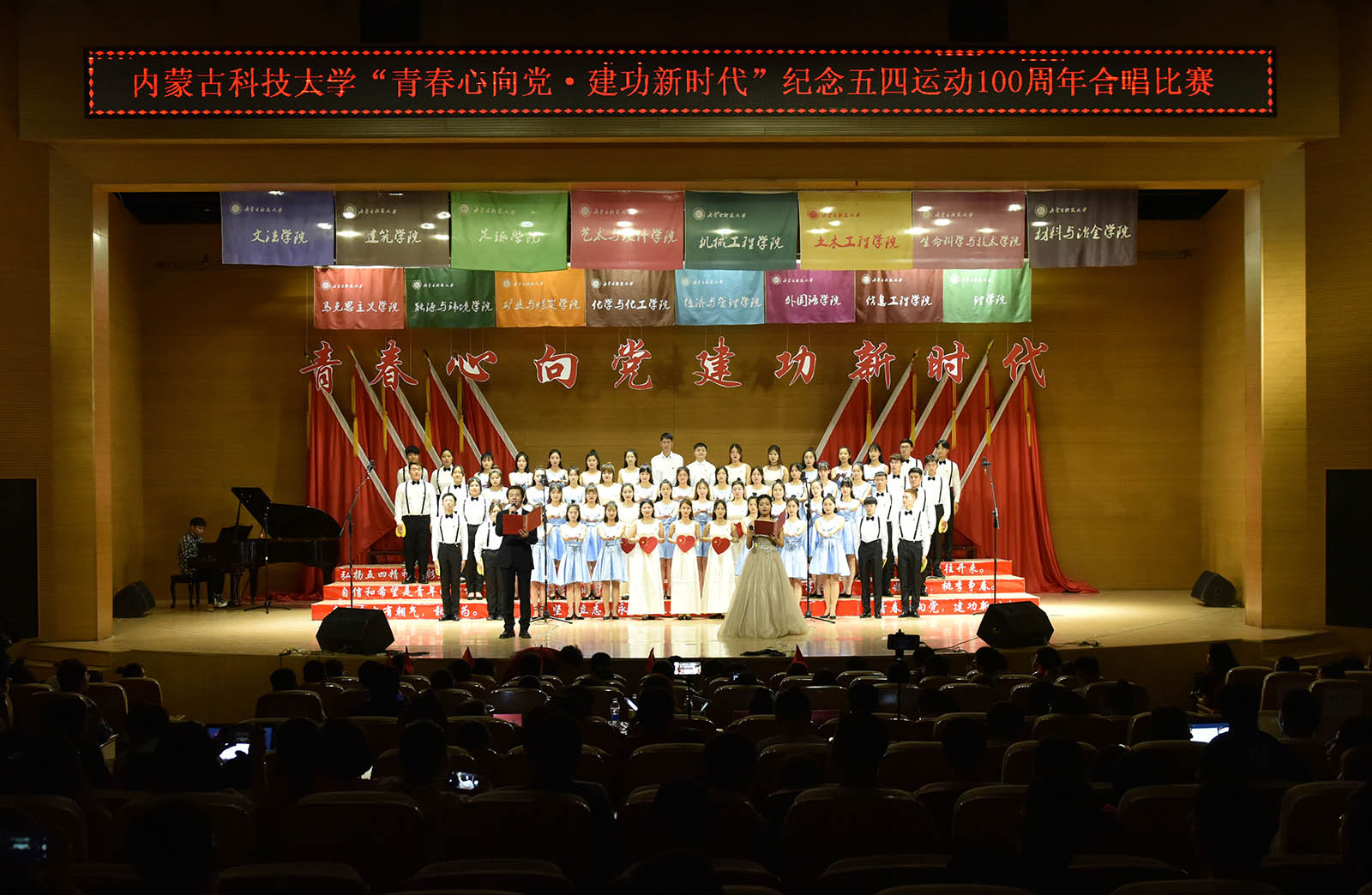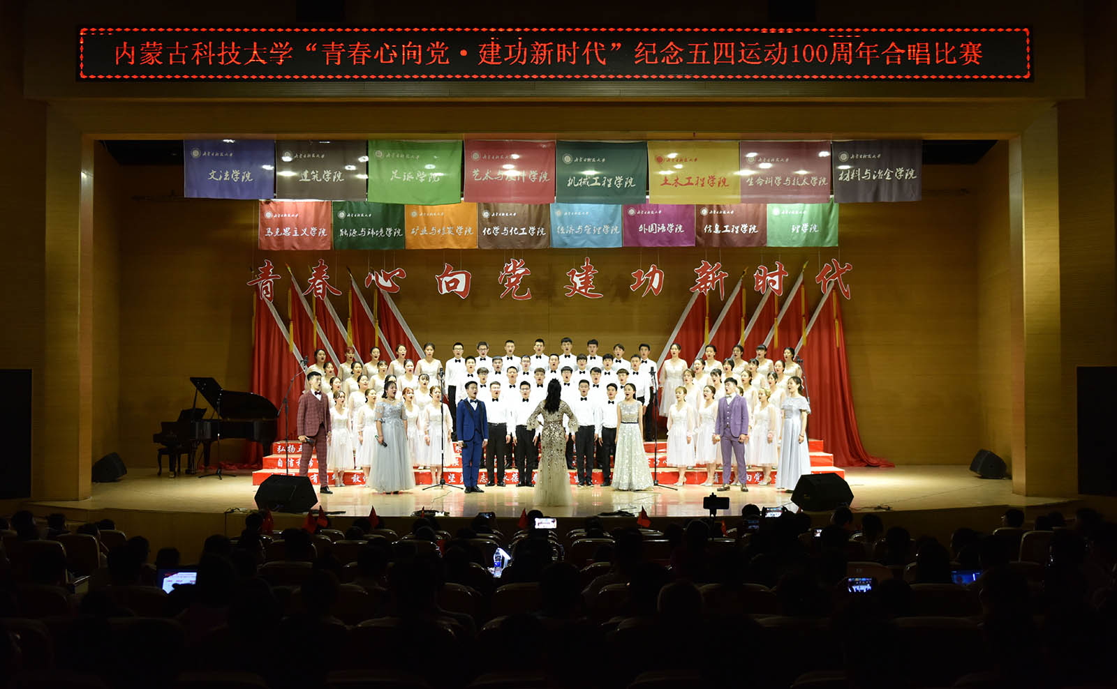 接下来,生命科学与技术学院合唱队曲调高昂地歌唱《走向复兴》;外国语学院合唱队手捧星灯,高举一颗“中国心”深情演唱的《莫合茹》;矿业与煤炭学院合唱队青春洋溢的《光荣与梦想》;信息工程学院合唱队的《在灿烂的阳光下》对祖国深情表白;建筑学院合唱队援引习近平总书记讲话,一首《中国之梦》,勉励在场青年;体育教学部(足球学院)和材料与冶金学院分别演绎了同一首《中国军魂》差异碰撞,军魂铮铮;能源与环境学院合唱队载歌载舞的《我家在中国》极具活力。