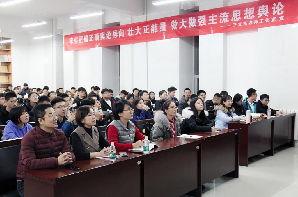 讲座中,王立东教授凭藉多年学术研究,用深入浅出的语言作了题为《当今中国的意识形态》的演讲,以当前我国意识形态工作的“极端重要性”为导言,阐述了“意识形态”概念、特点、内容构成,沿着党的历史、时政热点、社会现实的逻辑脉络,生动讲述了我国意识形态问题的由来、意识形态问题的具体表现、意识形态问题的历史演变、当前我国意识形态的原则。王立东的讲座理论性强、学术性高又切近实际,赢得了现场所有师生多次热烈的掌声。
