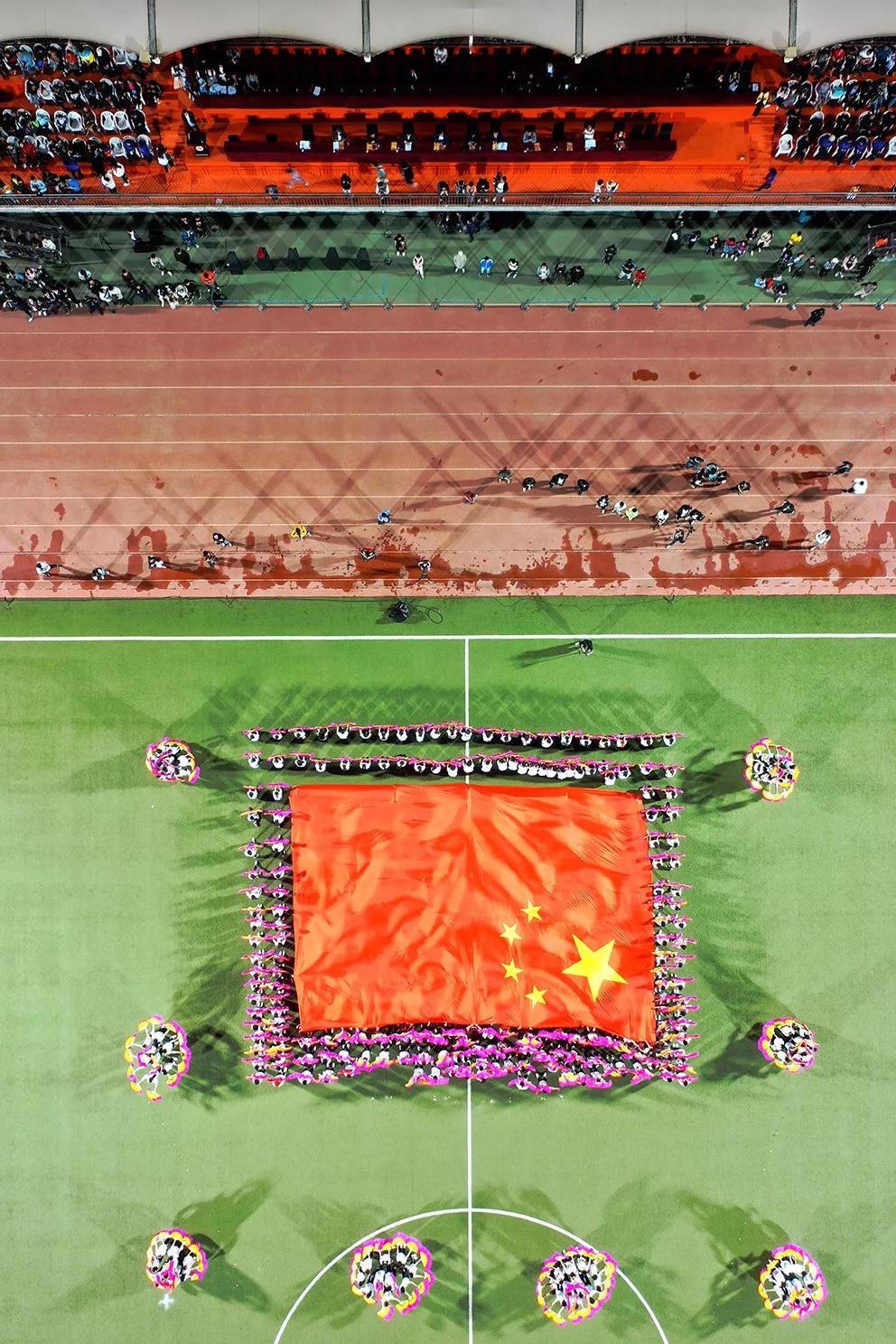 踩高跷、舞狮、摩托车队……各学院方阵创意十足。之后,一场别出心裁的《我爱你中国》快闪赏心悦目。