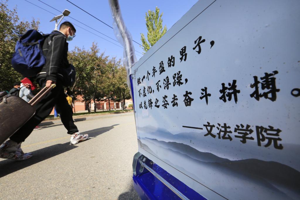 “做一个丰盈的男子,不虚化,不浮躁,以先锋之姿去奋斗去拼搏。”该校文法学院志愿者帮新生托运行李的小推车被装饰一新,短短的几句话,蕴含了该学院对新生的祝福之情。