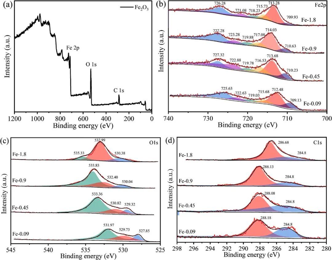 图4:XPS谱图:(a)全谱,(b)Fe2p,(c)O1s,(d)C1s