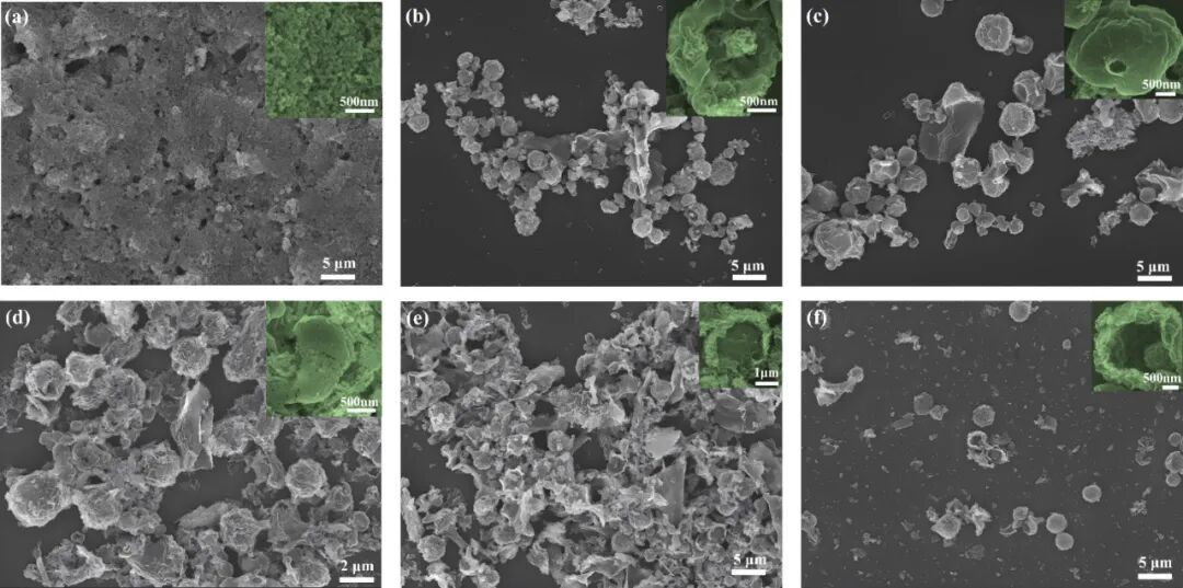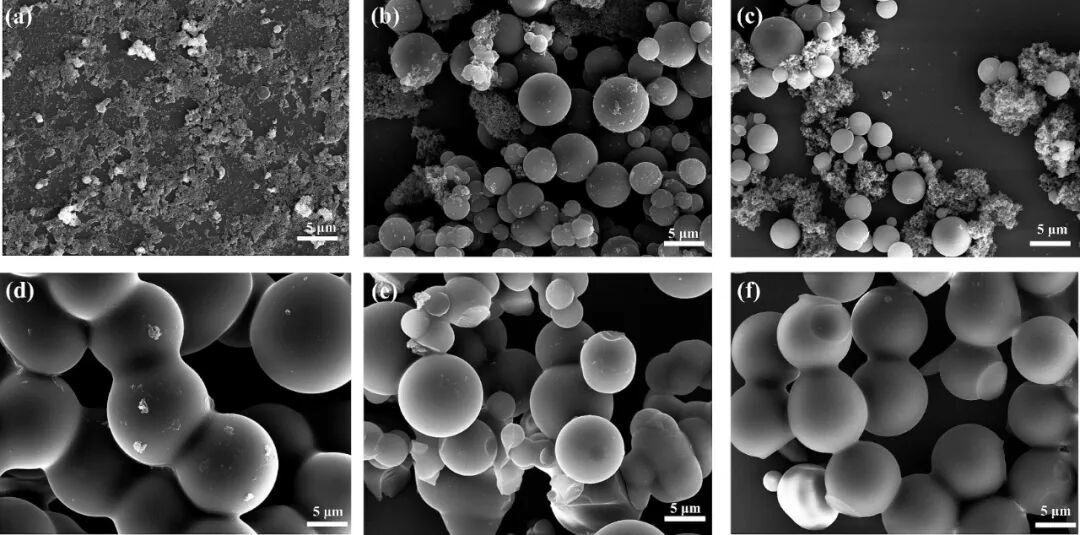 图3:(a)Fe-0.09、(b)Fe-0.27、(c)Fe-0.45、(d)Fe-0.91、(e)Fe-1.35和(f)Fe-1.8的SEM图像
