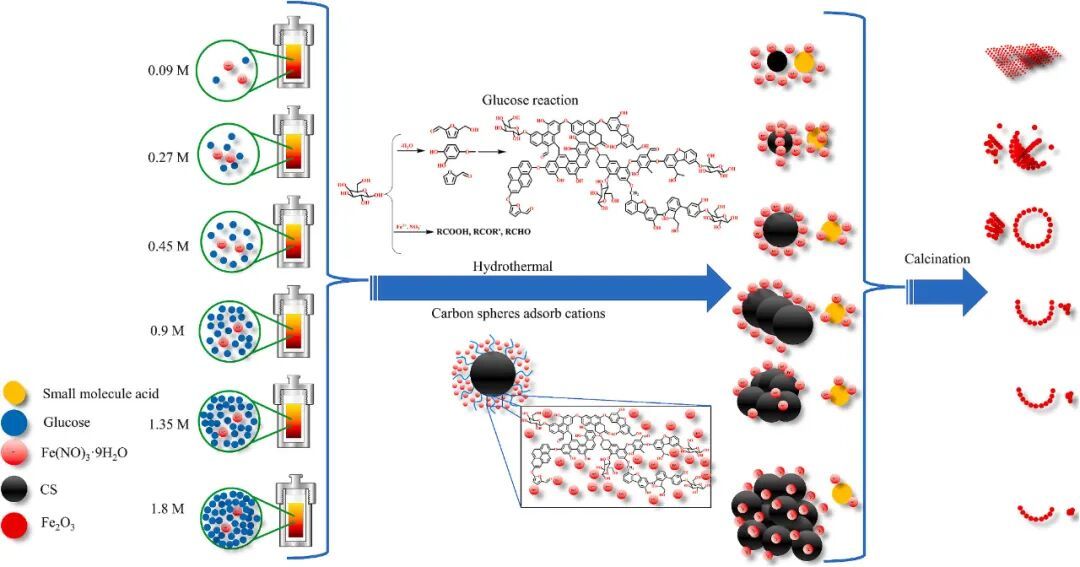 通过调节反应体系中的葡萄糖浓度,可以精确控制Fe2O3结构的形成过程和最终形貌:在低浓度(<0.45M)下,形成纳米颗粒,在中等浓度下,动态平衡机制促进碳层均匀包裹核心并自组装成规则的微球结构;而在过高浓度(>0.45M)时,由于碳层的过度生长,结构变得不稳定。在反应过程中,葡萄糖氧化产生的有机酸与Fe3+或Fe2+(Fe3+还原)结合形成金属有机中间相,该中间相的热力学演化最终产生Fe2O3。Fe-0.45的最终形貌光滑圆润,平均粒径为2.88μm,平均孔径为20.3nm,比表面积为20.1m2/g。