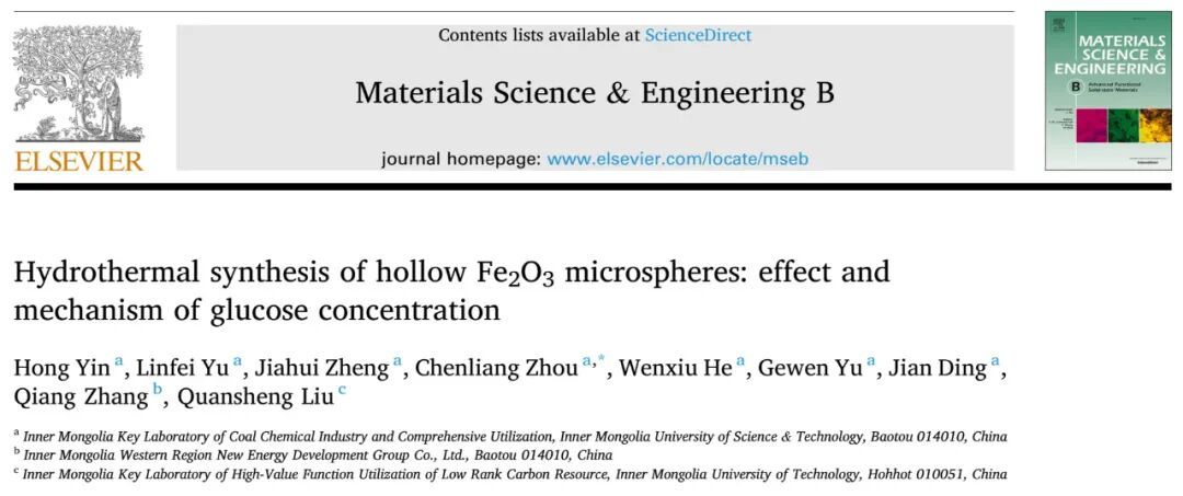 近日,伟德官网化学与化工学院碳基能源清洁高效转化与低碳利用团队周晨亮副教授研究成果在MSEB上发表,相关研究成果以《Hydrothermal synthesis of hollow Fe2O3 microspheres: effect and mechanism of glucose concentration》为题,发表在《Materials Science & Engineering B》上。