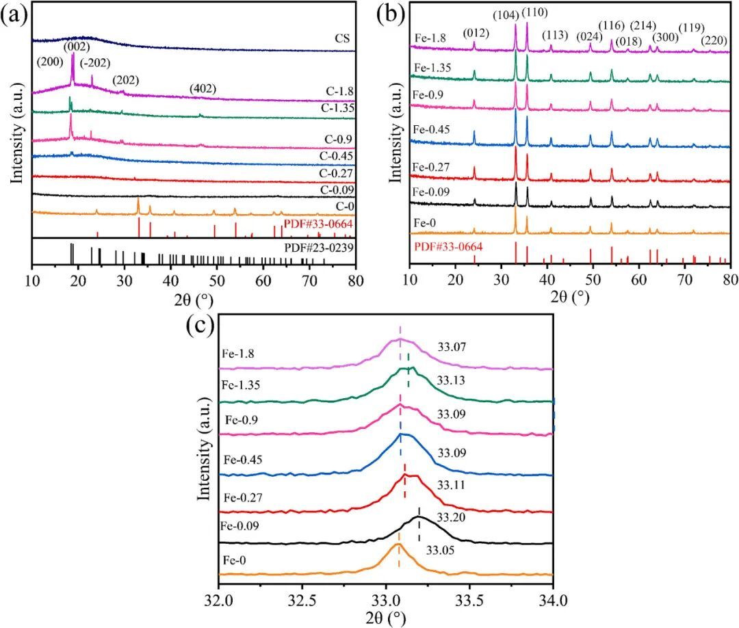 图1:XRD(a)前驱体,(b)Fe2O3(c)在32-34º范围内局部放大图