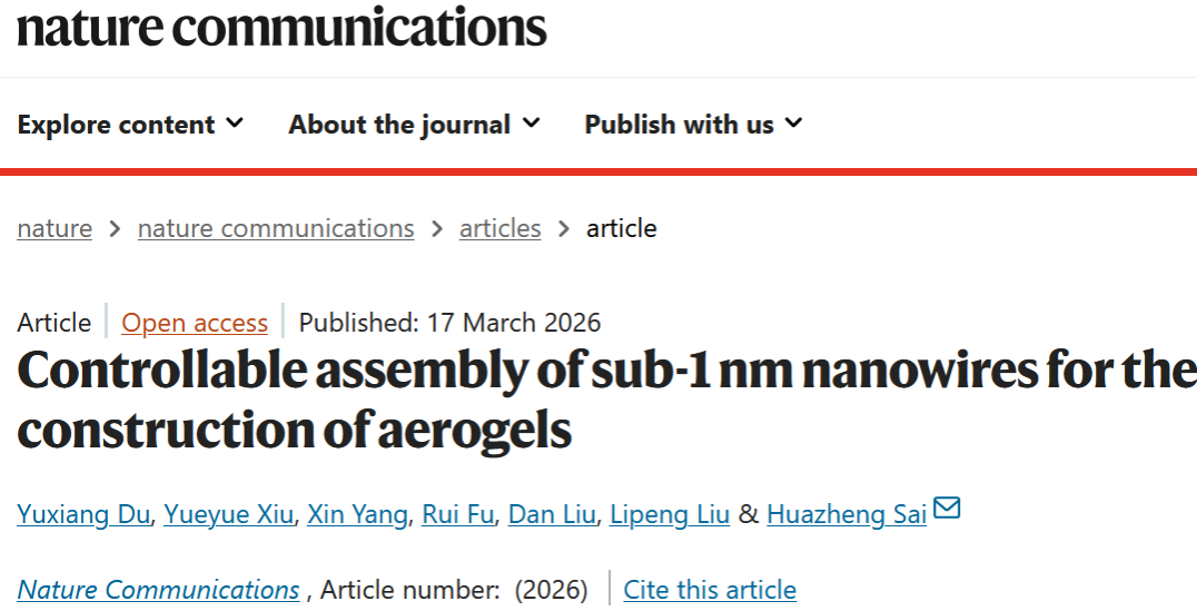 近日,伟德官网化学与化工学院(硅业学院)赛华征教授团队在稀土基亚纳米线气凝胶可控构筑领域取得新突破,相关成果“Controllable assembly of sub-1 nm nanowires for the construction of aerogels”发表于综合性国际顶级期刊《Nature Communications》(DOI: 10.1038/s41467-026-70713-8)。赛华征教授为论文的独立通讯作者,化学与化工学院(硅业学院)硕士研究生杜玉祥为论文第一作者,伟德源自英国始于1946为唯一完成单位。