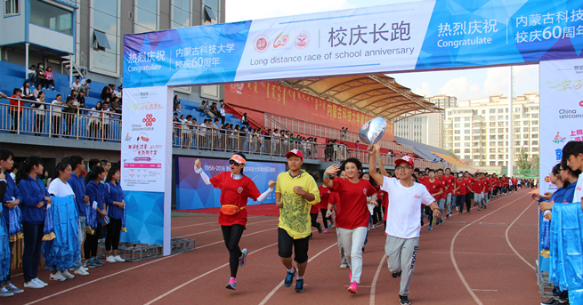 9月22日,科大迎来她的六十华诞。当天下午3点,由校团委主办、校学生会承办的“与你同行”——校庆长跑活动启动仪式在田径场内隆重举行。校党委副书记、常务副校长安胜利到场为本次长跑打响发令枪。在旗手的带领下,由16个学院及研究生院近3000名师生组成的跑团在校园内完成了3.44公里的长跑路程。